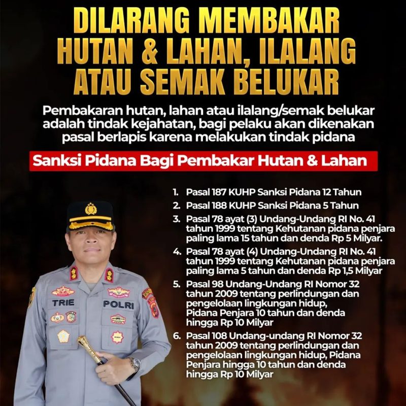 Dalam imbauan resmi yang beredar, tindakan membakar hutan dan lahan disebut sebagai tindak kejahatan serius yang dapat dikenakan sanksi pidana berlapis sesuai ketentuan peraturan perundang-undangan yang berlaku di Indonesia.