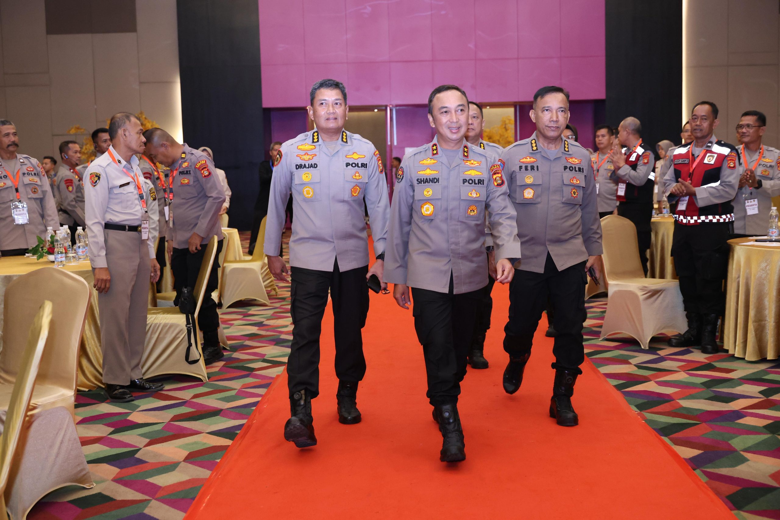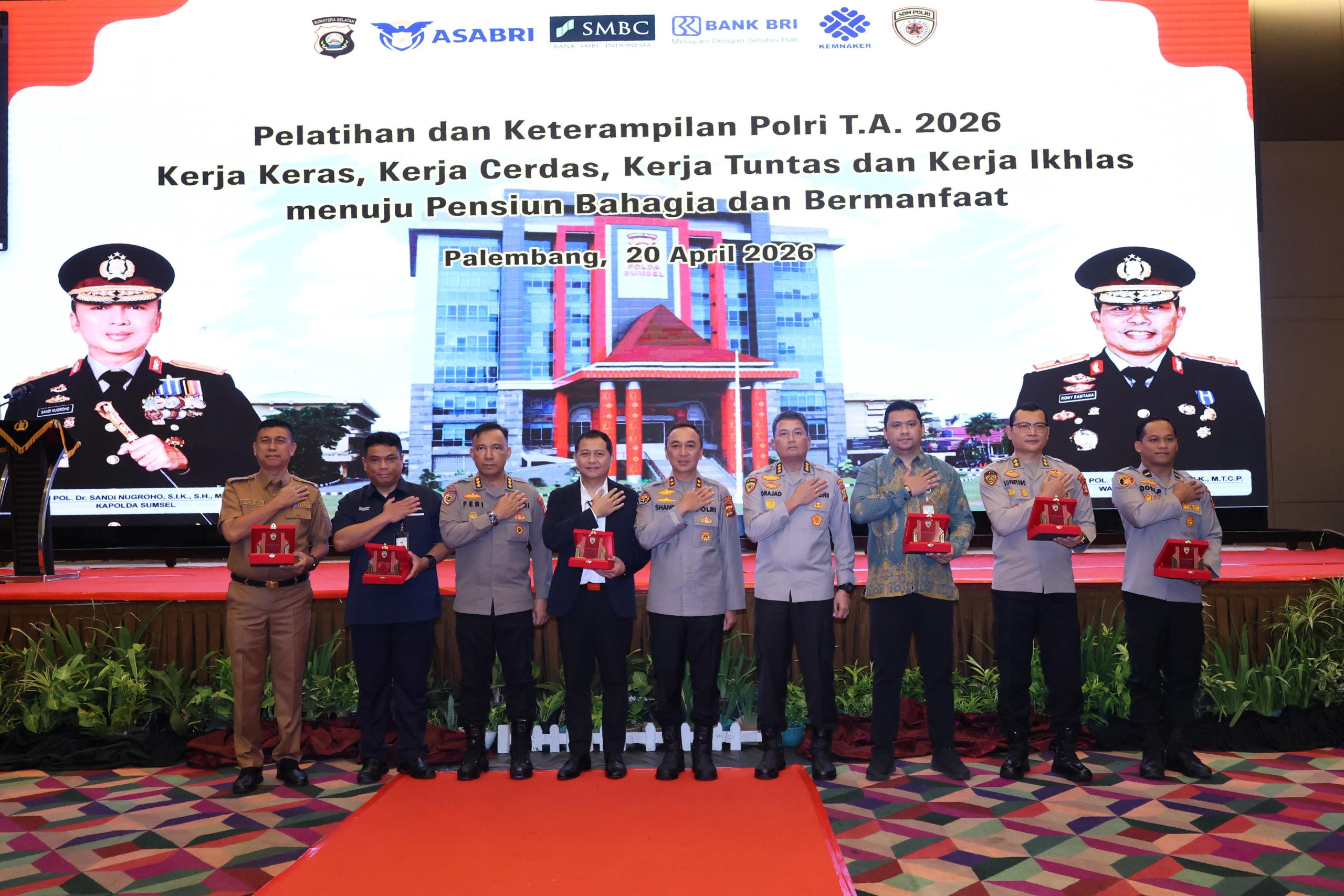 Hadir dalam kegiatan tersebut para Pejabat Utama Polda Sumsel, Kepala Dinas Tenaga Kerja dan Transmigrasi Provinsi Sumatera Selatan H. Indra Bangsawan, Pimpinan PT Asabri Cabang Palembang Mukhtiaryanto, Regional Business Leader Bank SMBC Cabang Palembang Pujanga Pradana Putra, serta Regional Head BRI Palembang Elvin Kamaludin. Kehadiran para pemangku kepentingan ini mempertegas sinergi lintas sektor dalam memberikan pembekalan yang komprehensif, mencakup aspek mental, keterampilan, hingga kesiapan finansial.