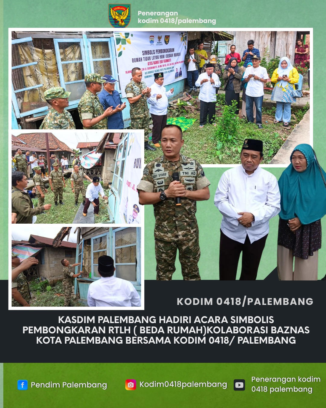 Dandim 0418/Palembang Kolonel Arh Erik Novianto, S.Sos dalam sambutannya melalui Kasdim menyampaikan bahwa kegiatan ini merupakan bentuk kepedulian TNI bersama BAZNAS terhadap masyarakat yang membutuhkan, khususnya dalam penyediaan hunian yang layak.
